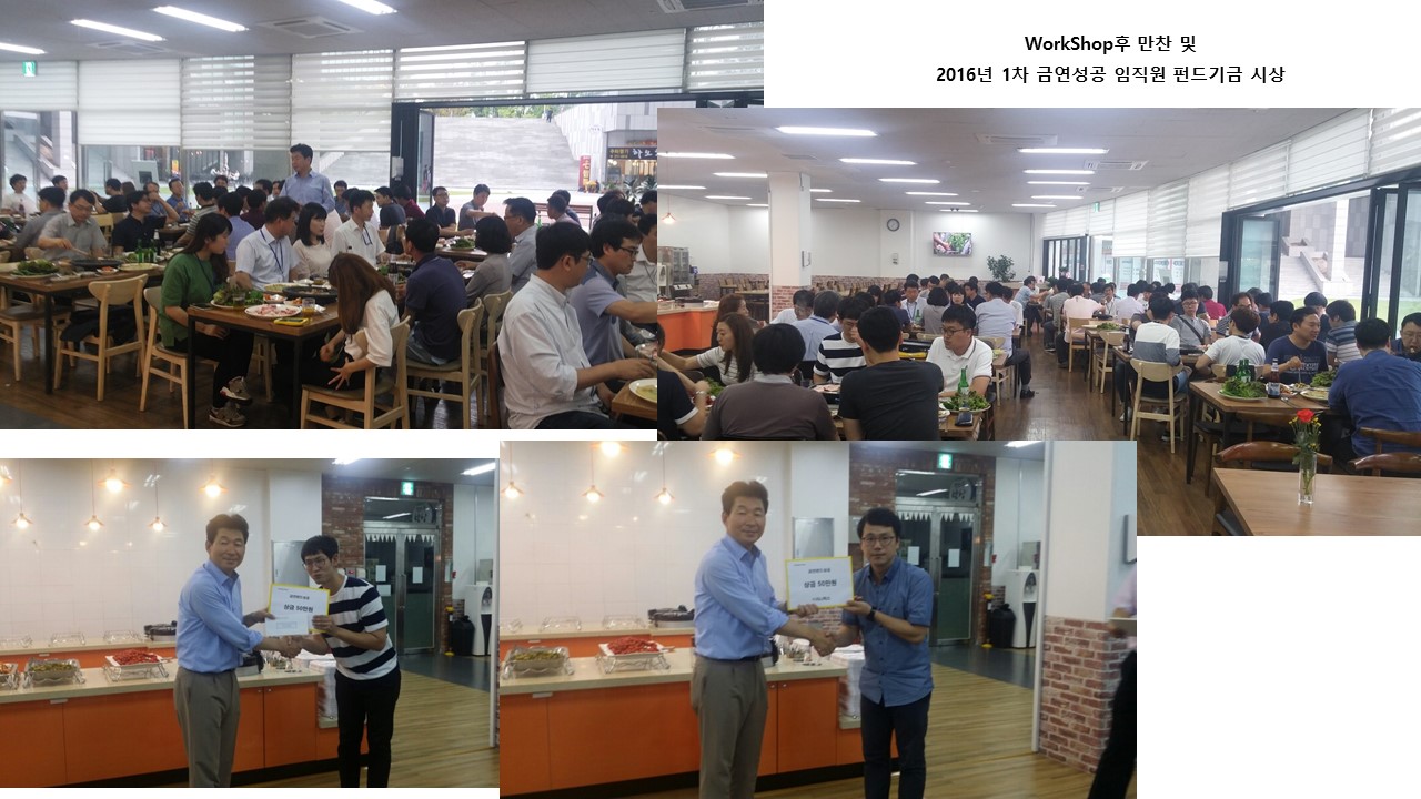 2016년 하반기 경영전략 WorkShop 이 지난 6월30일(목요일) 흥덕IT밸리 IT컨밴션센터에서 진행이 되었습니다. 각 부서(팀)별 상반기 성과 및 미비점, 하반기 계획에 대해 발표를 하였으며 2부 순서로 임직원 만찬전 2016년 금연캠페인으로 1차(1월1일~6월30일) 금연성공 직원에 대한 금연펀드 기금 수여가 있었습니다.